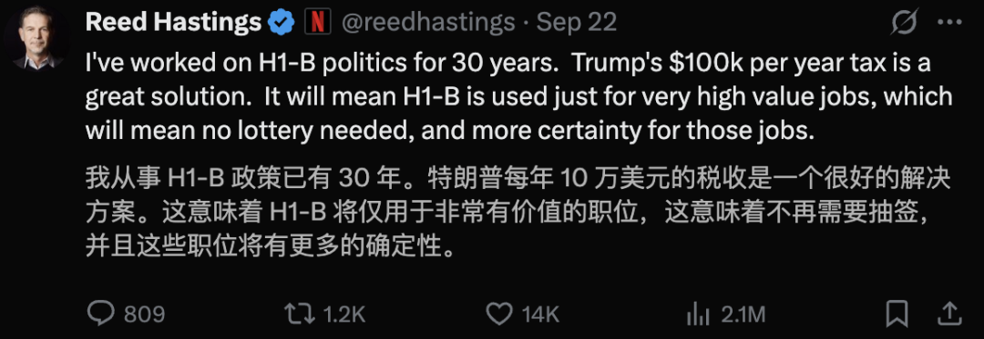 Netflix联合创始人Reed Hastings和OpenAI的奥特曼都认为,这种「氪金玩家」模式能够更好地筛选出顶尖人才,将签证留给真正高价值的岗位。