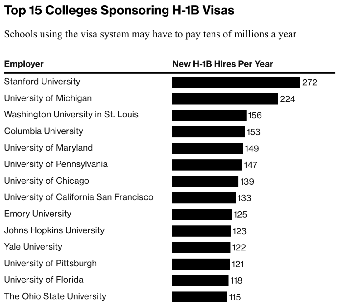 其他H-1B签证大户高校,如哥伦比亚大学、密歇根大学、哈佛大学和圣路易斯华盛顿大学,每年都雇用数百名员工。