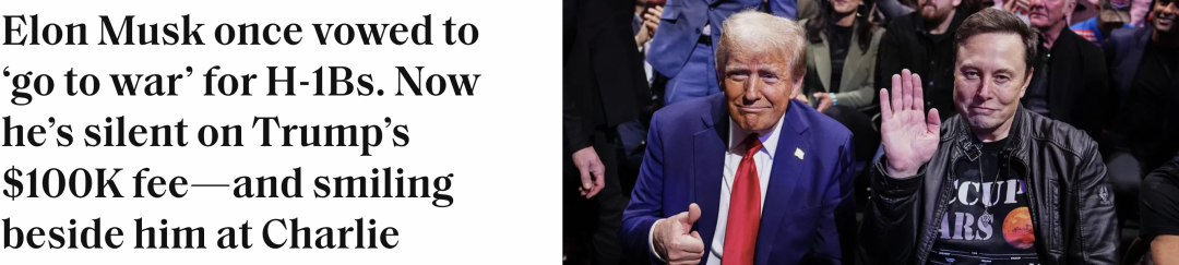 去年年底,马斯克承诺将为捍卫H-1B签证制度而站;现在,白宫为每份新申请收取10万美元费用,马斯克却保持沉默——还和总统一起在查理·柯克的葬礼上微笑合影。