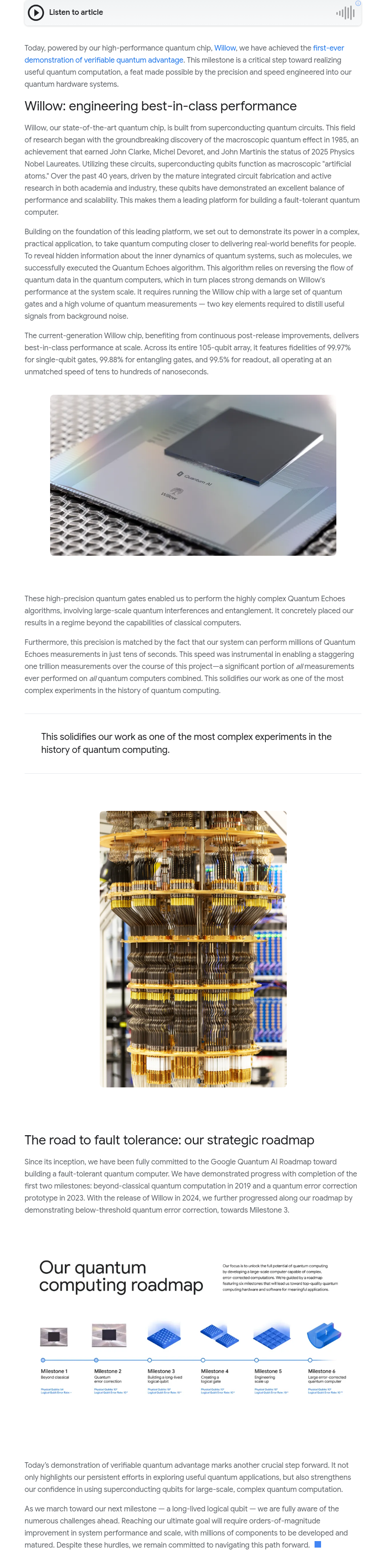 今日,凭借高性能量子芯片Willow,我们首次实现了可验证的量子优势,标志着迈向实用化量子计算的关键一步。Willow基于超导量子电路构建,其核心技术源于1985年发现的宏观量子效应,该成果使John Clarke、Michel Devoret和John Martinis荣获2025年诺贝尔物理学奖。作为“人工原子”,超导量子比特在过去40年中依托成熟的集成电路制造工艺及学术与产业的持续投入,在性能与可扩展性之间实现了优异平衡。Willow正是这一技术积累的集大成者,展现出卓越的精度与运算速度,为量子计算的实际应用奠定硬件基础。
