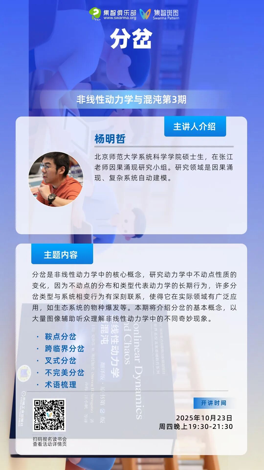 扫码参与「非线性动力学与混沌」读书会,加入社群,获取系列读书会永久回看权限,与社区的一线科研工作者沟通交流,共同溯源复杂科学的思想脉络。