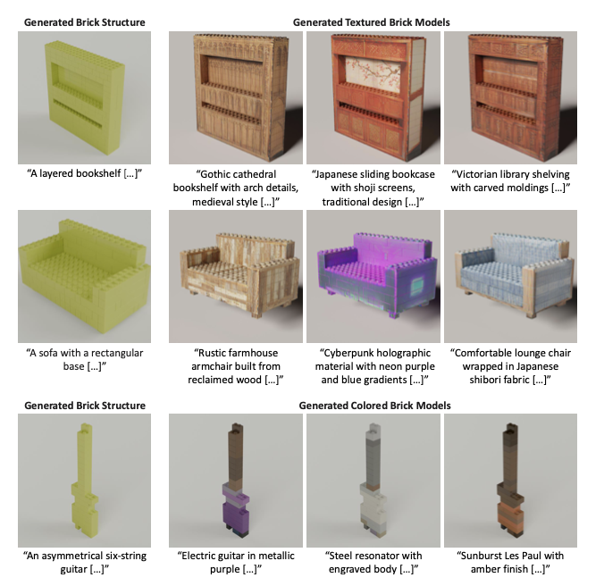 研究团队构建了一个大规模、物理稳定的积木结构数据集StableText2Brick,包含超过47000个积木结构,涵盖28000多个独特三维物体,每个结构均配有详细的文字描述,并训练了一个自回归大型语言模型,通过逐步预测“下一个积木”来生成完整结构。
