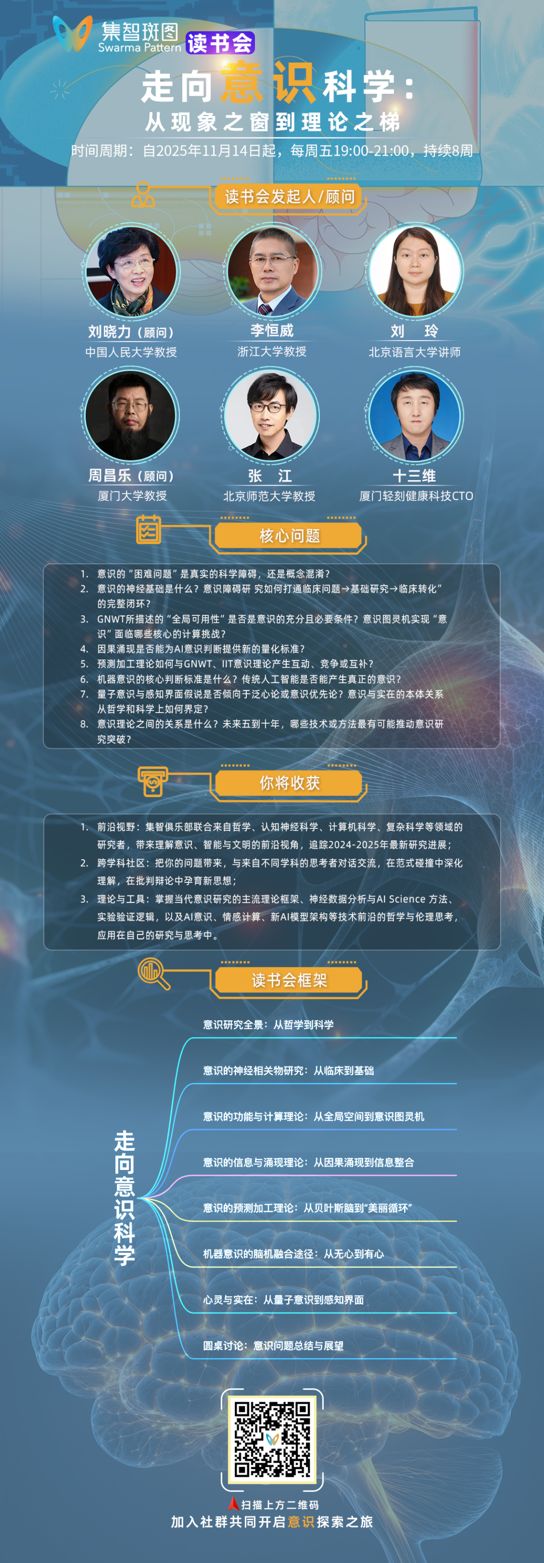 为了对意识问题进行系统探讨,集智俱乐部联合来自哲学、认知神经科学、计算机科学、复杂科学领域的研究者共同发起「意识科学读书会」,跨越理论与实证、功能与现象、生物与人工的视角,全面深入研讨意识这一现象本身。重点探讨当代主流意识理论的核心主张与分歧,神经机制与主观体验之间的桥梁,以及AI意识、脑机接口等技术如何重塑人类意识主体的边界与文明的未来。