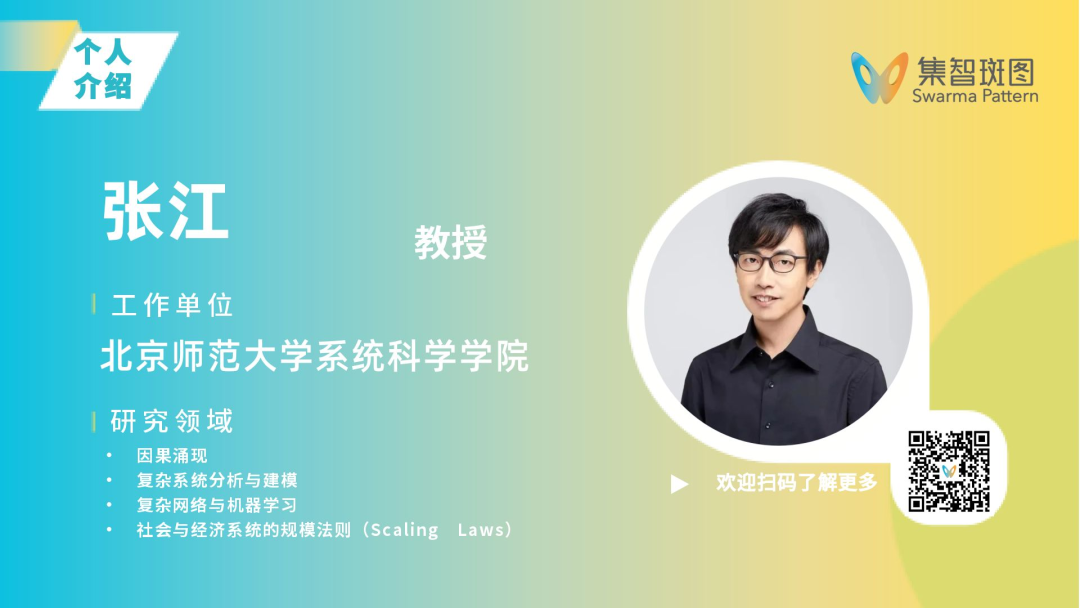 张江,北京师范大学系统科学学院教授,集智俱乐部创始人,集智学园(北京)科技有限公司创始人兼董事长,集智研究中心理事长,National Science Review 编委成员。多篇文章发表在包括:Nature Communications、Nature Machine Intelligence、National Science Review、Nonlinear Systems、Chaos等国际知名刊物上。曾出版专著《规模法则——探索细胞到城市的普适规律》、第二作者合著《数字创世纪——人工生命的新科学》,及译著《自然与人工系统中的适应——理论分析及其在生物、控制与人工智能中的应用》等。
