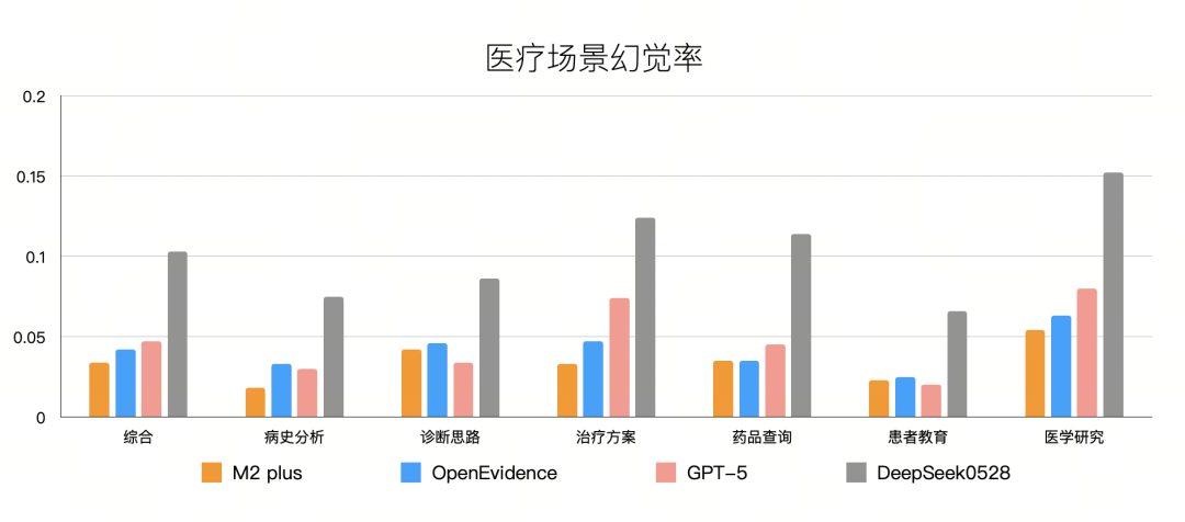在多场景医疗评测中,M2 Plus幻觉率指标,较Deepseek-R1低3倍,并且显著领先美国最火医疗产品OpenEvidence。