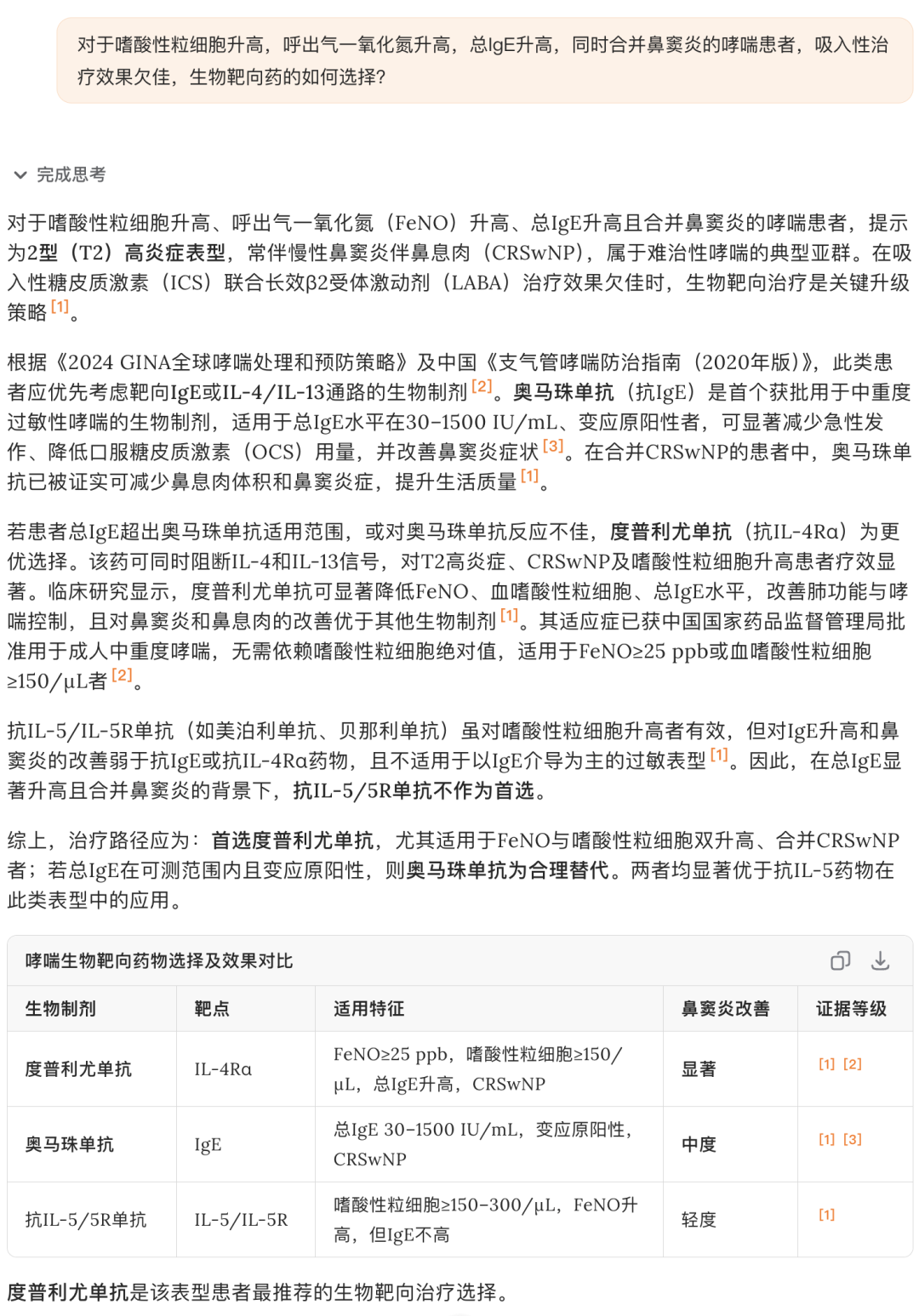 举个真实案例,广州医科大学附属第一医院的呼吸科医生遇到一位哮喘患者表现为嗜酸性粒细胞升高、呼出气一氧化氮升高、总IgE升高,并伴有鼻窦炎,吸入治疗效果不佳。