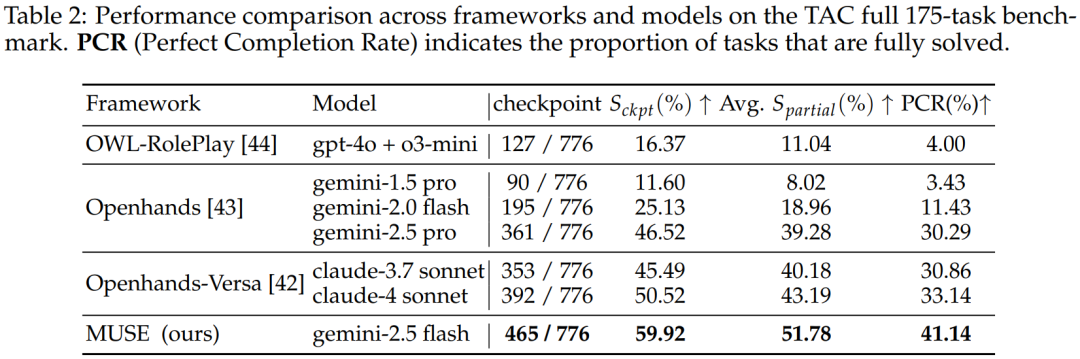 在专为长期生产力任务设计的基准测试TAC (TheAgentCompany) 上,MUSE取得了显著的SOTA性能。最令人惊讶的是,MUSE仅使用轻量级的Gemini-2.5 Flash模型,就击败了使用更大模型(Claude Sonnet 4)的现有SOTA方法, 在TAC的指标上首次突破50%大关,达到51.78%。这证明了 “经验驱动的自我演化机制”具有良好的前景。