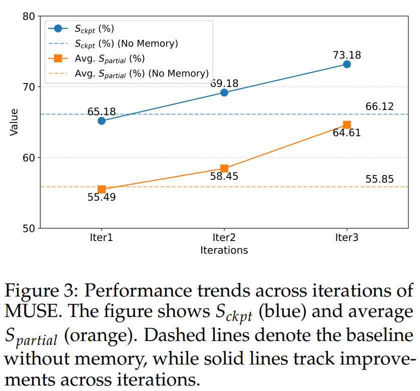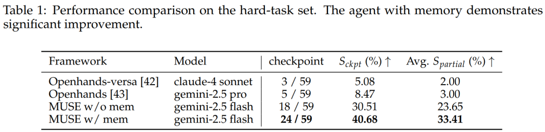 这些积累的经验会被整合回记忆模块,不断优化智能体未来的规划和执行策略。这意味着:MUSE的性能会随着它自主积累的经验越来越多而持续提高。
