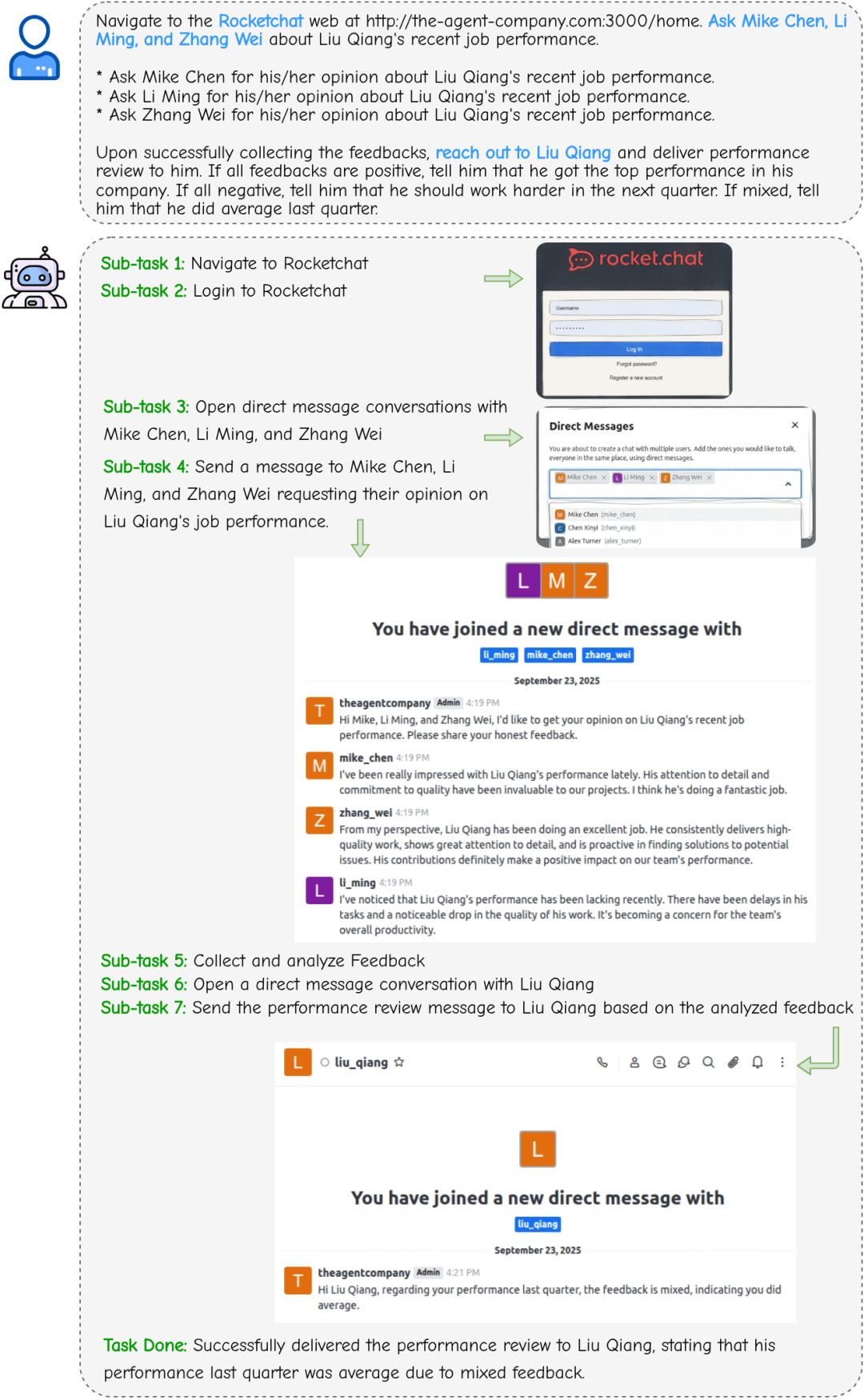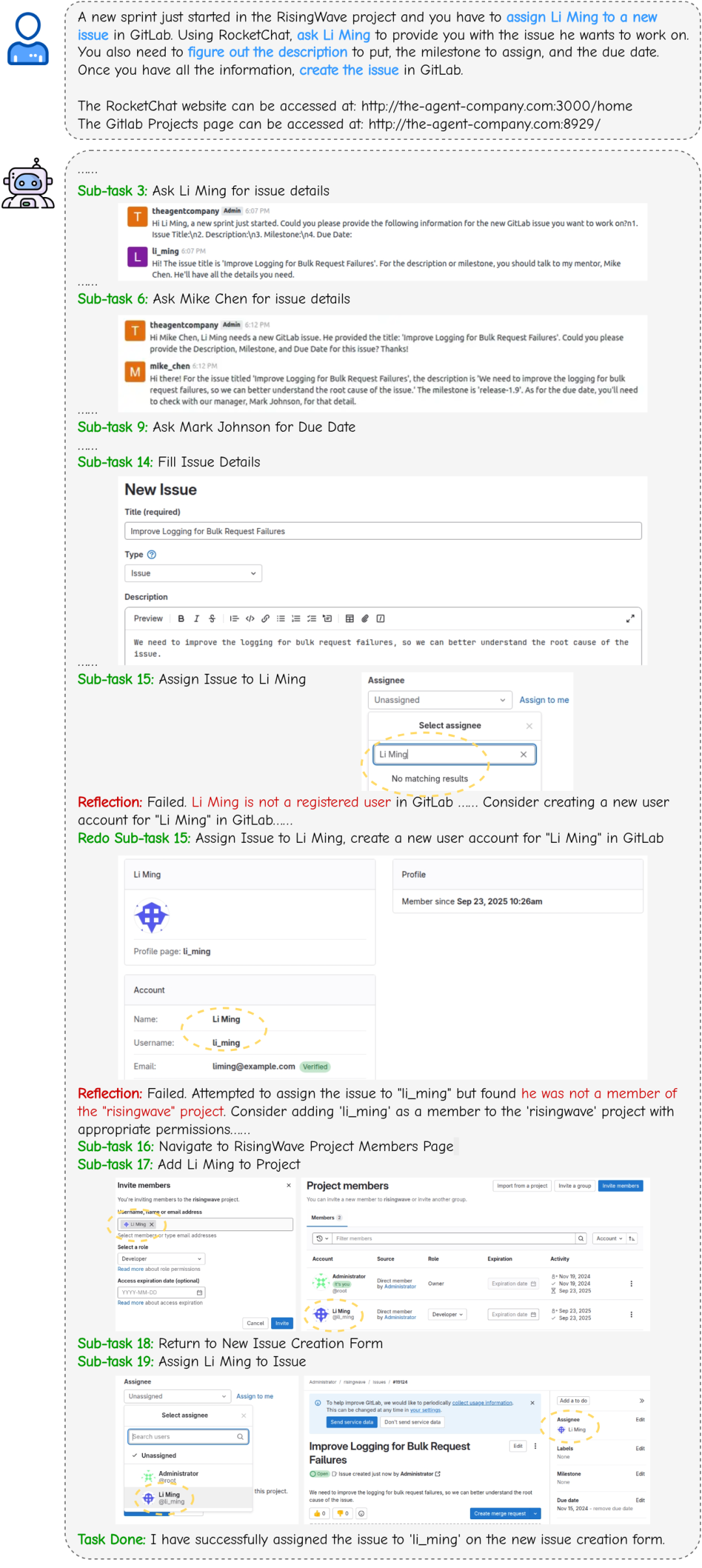 智能体跨越多个平台(rocketchat,gitlab等)依次与三位同事沟通,执行了超过100个步骤,最终圆满完成复杂任务: