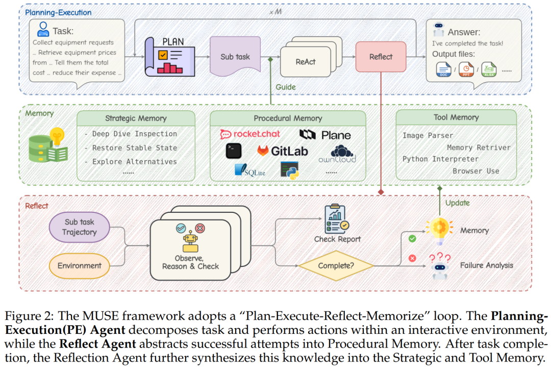 通过持续的“规划 → 执行 → 反思 → 提取经验”的四步闭环循环,MUSE 实现了真正的自我演化。