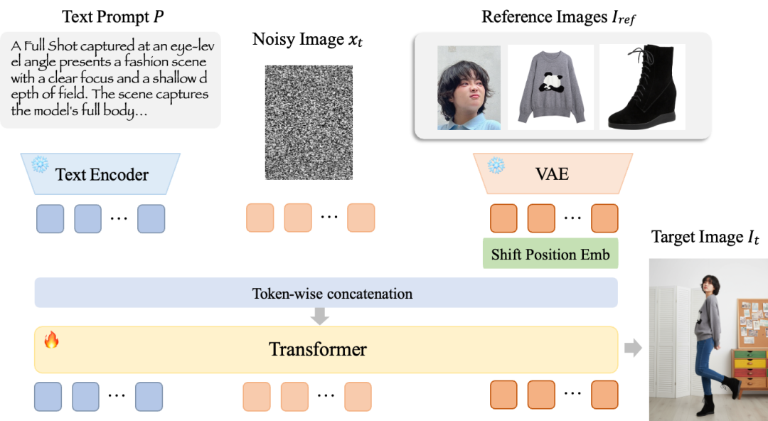 对于参考生图模型,多条件的一致性数据是极难获取的,通常我们能获取到的数据都只是单条件一致性数据,例如在一家商铺中,同时筛选出单件服饰平铺图数据和模特上身图数据是比较容易的,但如果想同时筛选出上下衣、人脸、鞋子、包包等配对数据则是十分困难的。因此我们设计了一种基于单参考图数据训练多参考图的框架,在这种架构下,我们可以方便地进行各种类目的扩展,并且由于大量单条件数据对的训练,我们的模型在不同类目的泛化方面也展现出了优秀的效果。另外,我们设计了多阶段的训练策略,来循序渐进地解决多参考生成中的一致性、美观度、稳定性问题。
