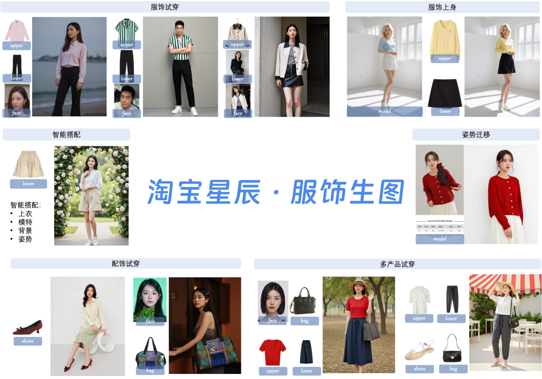我们推出淘宝星辰·服饰生图模型,该模型具备一键式生成模特展示商品素材的能力,涵盖多品类(服装、箱包、鞋靴等)、 多模特人群(男性、女性、儿童)和多样化输入形式(平铺图、非平铺图、Mask-Free)输入,支持多个业务场景,可在万象营造进行体验使用。相比以往类似技术方案,我们在三个核心维度实现突破:
