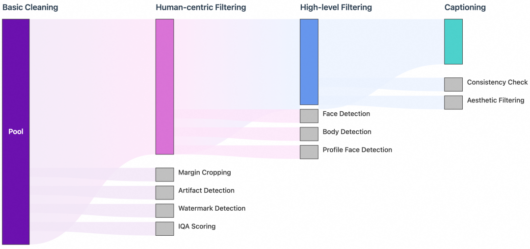 高质量训练数据是驱动模型能力提升的核心引擎,我们进行了广泛的数据寻源工作。为了提高数据清洗效率,构筑了一套完整的自动化数据筛选链路,沉淀单图精筛、多图组对等多个阶段的清洗流程。在清洗过程中,我们主要从以下几个维度来定义高质量数据: