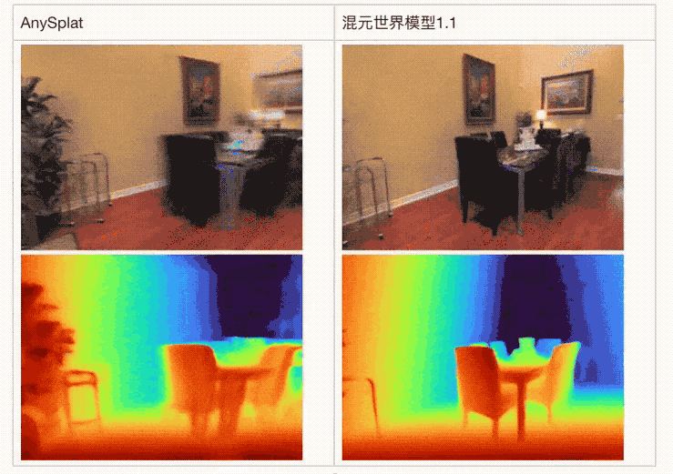 混元世界模型1.1在几何精度和细节还原上都全面超越了AnySplat,场景重建更稳定,也更真实。