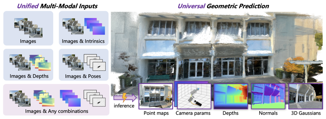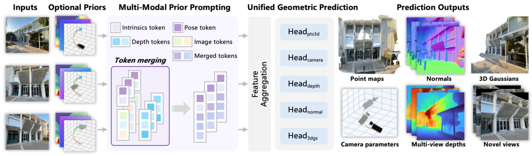 不仅支持额外的相机、深度等多模态先验输入,还能同时实现点云、深度、相机、表面法线和新视角合成等多任务统一输出,性能达成新的SOTA。