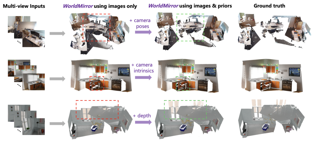 传统3D重建方法只能处理原始图像,无法利用现实应用中常见的额外信息,混元世界模型1.1则突破性地提出多模态先验引导机制,支持灵活注入: