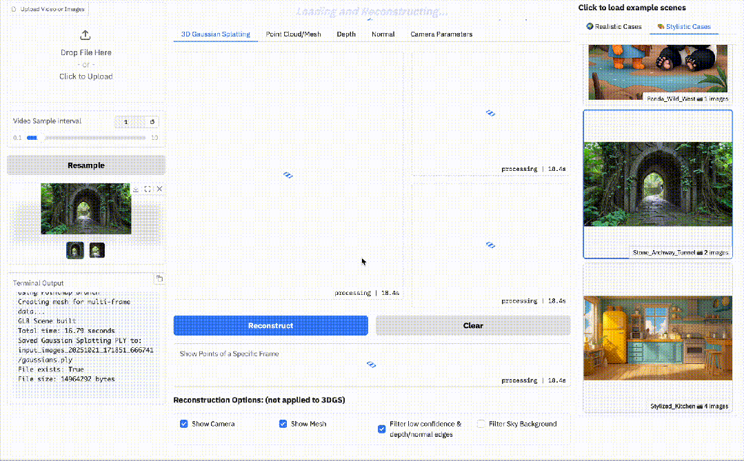 点云:密集点云回归 多视角深度图:逐像素深度估计 相机参数:完整位姿和内参预测 表面法线:支持高质量网格重建 3D高斯点:直接用于实时新视角渲染