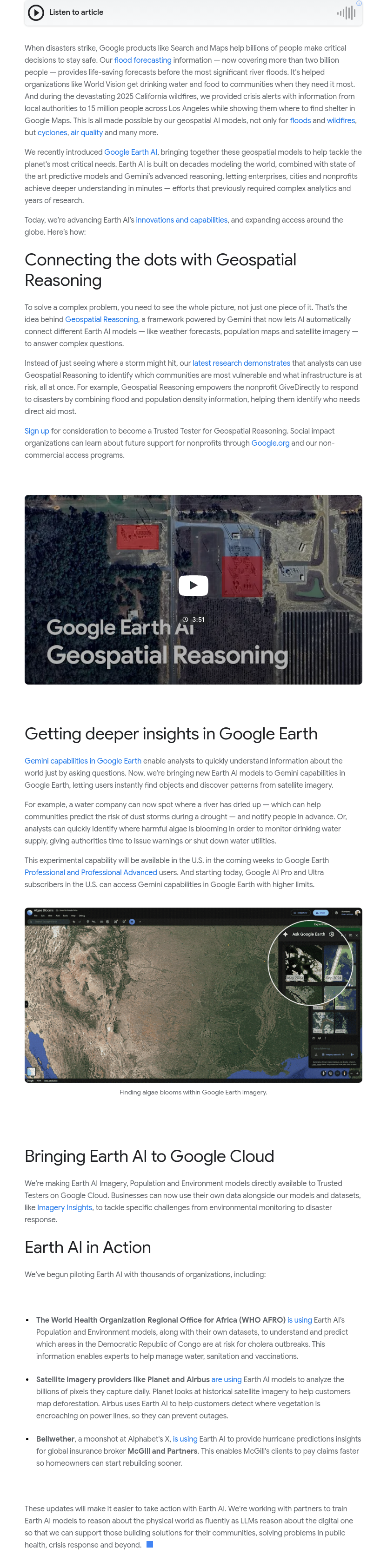Google利用Search、Maps等产品帮助全球数十亿人在灾害中做出关键安全决策。其洪水预测系统已覆盖超20亿人,为世界宣明会等组织提供支持,在2025年加州山火期间向洛杉矶1500万人发送危机警报,并通过地图指引避难所位置。这些能力依托于谷歌先进的地理空间AI模型,应用于洪水、野火、气旋、空气质量等多个领域。最新推出的Google Earth AI整合了多年地理建模经验与前沿预测技术,结合Gemini的高级推理能力,致力于应对全球最紧迫的环境与人道挑战。