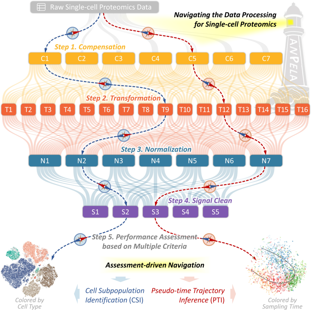近日,围绕“如何选择最优流程以显著提升处理性能并获得可靠生物学见解”这一单细胞蛋白质组学领域的前沿挑战,浙江大学药学院朱峰教授、付婷婷博士团队在《Nature Protocols》发表研究论文“navigating the data processing for cytometry-based single-cell proteomics”,提出面向单细胞蛋白组学的数据处理工作流优选方法ANPELA(https://idrblab.org/anpela/)。该方法以机器学习与多维度评估为支撑,聚焦细胞亚群鉴定与伪时间轨迹推断两项关键任务,在提升处理稳健性与准确性的同时,为药理机制解析与精准医学研究提供可复用、可推广的单细胞蛋白组学数据处理技术路径。