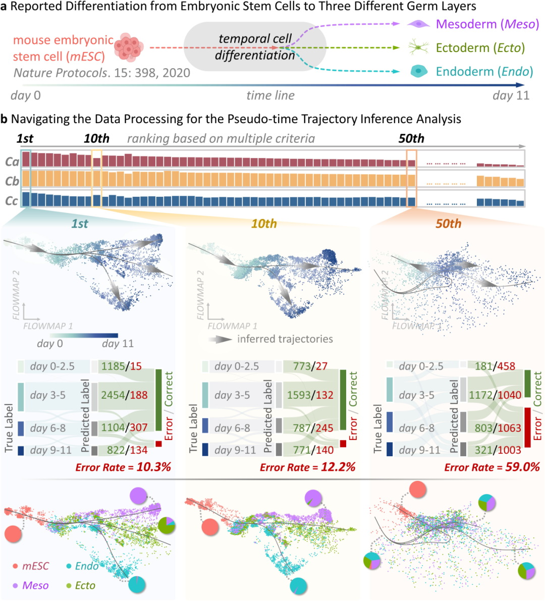 在小鼠胚胎干细胞分化的单细胞蛋白组学数据上,研究团队进一步验证了所提出方法对伪时间轨迹推断的显著增益。该数据覆盖连续11天的多时间点采样,理想的轨迹应自胚胎干细胞出发,沿三条支路分别分化为外胚层、中胚层与内胚层,并在时间序列上与真实生物进程相一致。然而,若直接采用领域内常用的处理流程,分析结果会出现严重偏差,不仅轨迹的起点与终点错误,伪时间与真实时间的误差也超过50%。在部分伪时间与真实时间的误差较低的数据处理结果中,其对应的细胞分化轨迹亦频繁缺失中胚层分支。