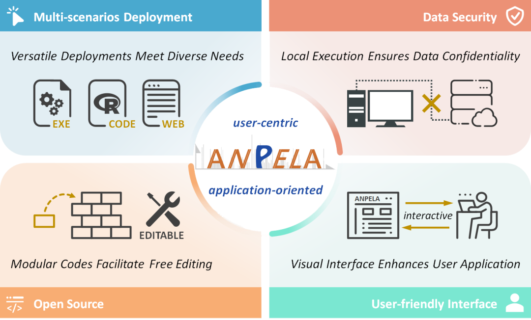 研究团队在可用性、安全性与可扩展性方面也做了一系列的工作,提供了多样化的访问形式,以保障用户体验。通过桌面软件、R包、在线平台及源代码的多场景部署,降低使用门槛,满足零代码和专业研究者的差异化需求。R包与桌面端均支持本地运行,无需上传私有数据,从源头保障数据安全。全部代码都在GitHub开源,并将功能模块化以确保代码可读性与二次开发友好度。本地与在线版本均配备直观的图形界面,辅以文字教程与交互式教程,帮助用户快速掌握方法要点并顺畅融入既有研究管线。