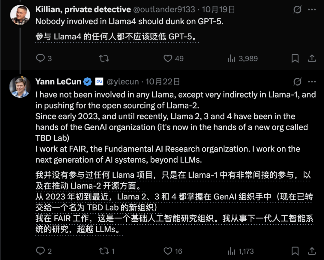 在最近与网友的互动中,LeCun还连续澄清自己和Llama项目没有过一毛钱关系。