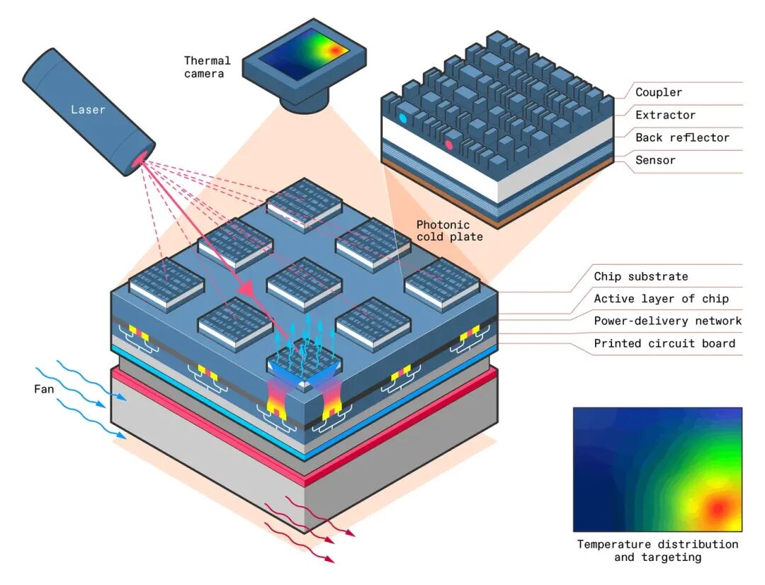 然后将一系列尺寸为一平方毫米的光子冷板平铺放置在芯片基板顶部,利用外部热像仪感应芯片热点,当热点出现时,激光照射热点旁边的光子冷板,刺激光子过程并提取其热量,最终实现降温目的。