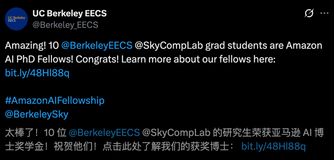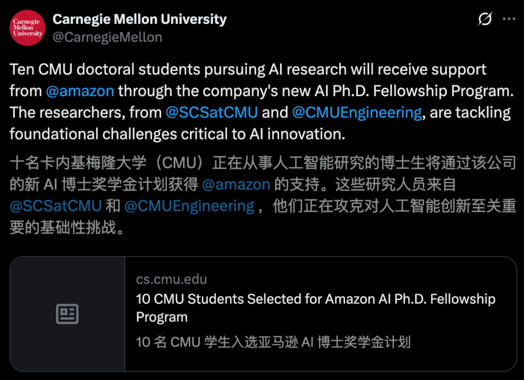 同样,CMU十位博士生荣获亚马逊奖学金。