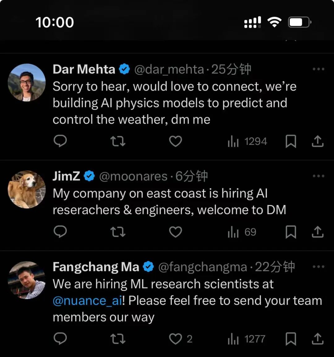这样一位大佬突然面临找工作了,OpenAI以及各路初创公司反应都很快,直接开始在评论区排队抢人。
