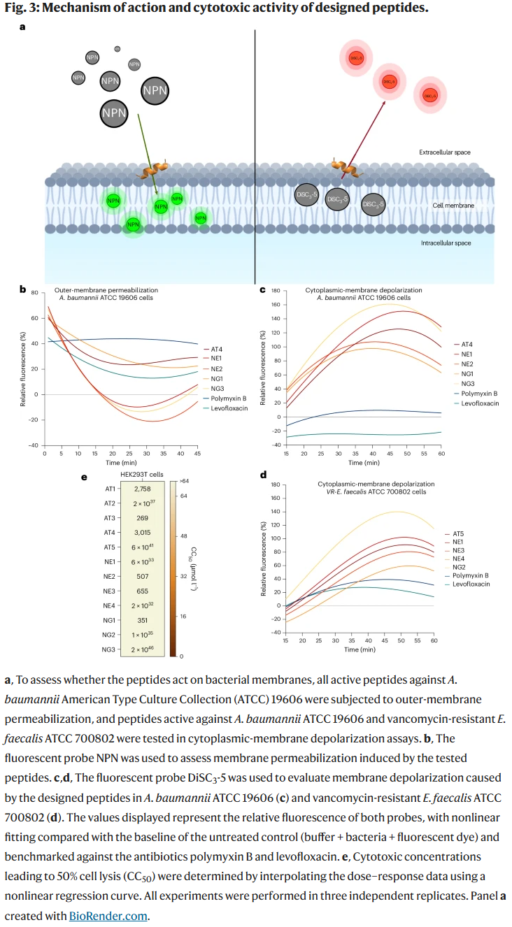 膜通透性与去极化实验显示,活性肽能破坏细菌外膜与细胞膜电位,尤其 NE1 与 NG3 对 A. baumannii 的细胞膜去极化效果显著。