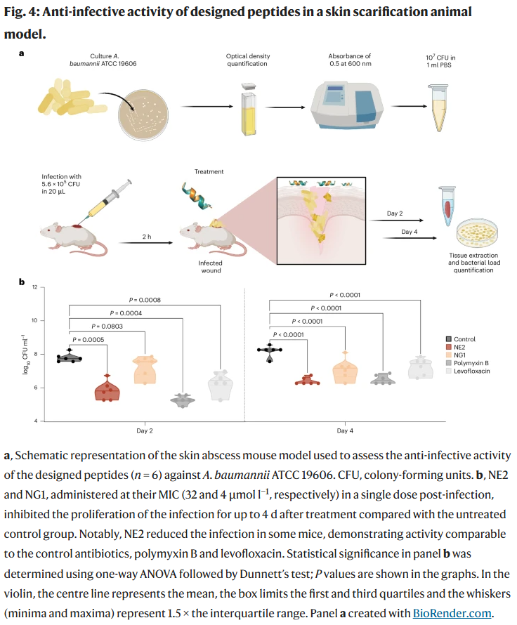 在小鼠皮肤感染模型与大腿深部感染模型中,NE2 与 NG1 以单次给药即可显著降低感染菌负荷(达两个数量级),疗效可与多粘菌素 B、左氧氟沙星相媲美,且未观察到明显体重下降或皮肤损伤。