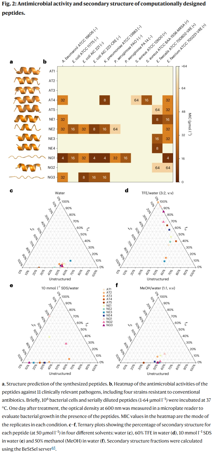 研究人员选取已知抗菌肽 IDR-2009(序列 KWRLLIRWRIQK)作为模板,通过四种不同目标函数组合(含能量、几何或描述符约束)生成多个候选序列。在合成的 12 条肽中,有 9 条(75%)在 11 株临床相关菌株上表现出 MIC ≤ 64 μmol·L⁻¹ 的抑菌活性。部分肽(如 NE2、NG1)在对多重耐药菌(MRSA、VRE)中展现出与多粘菌素 B 或左氧氟沙星相当的效力。