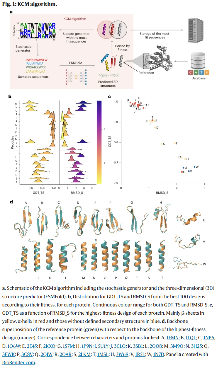计算蛋白质与肽的设计正成为一种能够精准操控结构与功能的变革性策略,在医学、生物技术与材料科学中展现出巨大潜力。然而,当前方法多依赖生成模型,这些模型训练成本高昂且难以针对新目标重新优化。研究人员提出了一种名为**Key-Cutting Machine(KCM)**的优化型平台,它通过结构预测与目标几何匹配的迭代优化实现定制化设计。KCM 仅需一块 GPU 即可运行,并允许在目标函数中灵活嵌入用户自定义约束,从而避免生成模型常见的高成本再训练。该方法采用分布估计算法(EDA),基于几何、理化与能量准则优化序列。研究人员在 α-螺旋、β-折叠及无序区域中进行了基准测试,结果显示其能够高精度地复现目标骨架几何。以抗菌肽为实例,KCM 成功生成了一种候选肽,对多种细菌株表现出显著体外抑菌活性,并在小鼠感染模型中展现疗效。KCM 为蛋白与肽的 de novo 设计 提供了一种灵活而高效的途径,能扩展现有模板的结构–功能关系。
