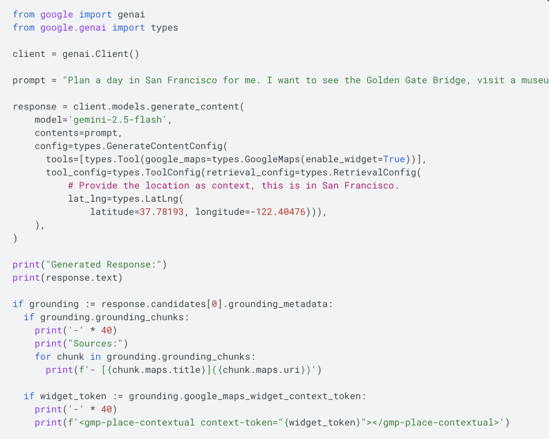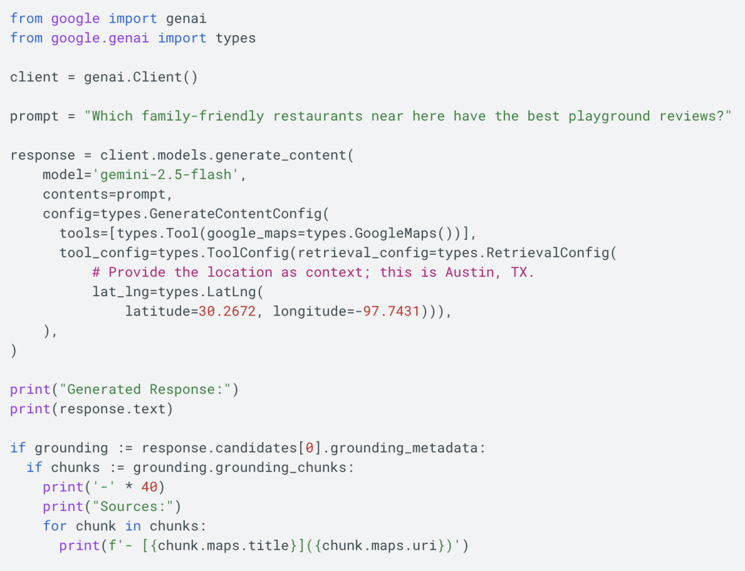 就像谷歌搜索锚定(Grounding with Google Search) 一样,谷歌地图锚定(Grounding with Google Maps)也能在涉及位置的信息查询中,为模型提供丰富且实时更新的数据支撑。