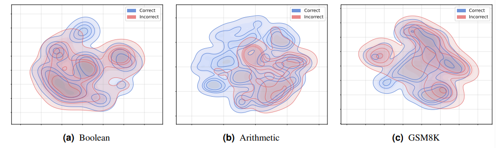 不同任务中正确与错误推理的拓扑特征分布。图中蓝色表示正确推理,红色表示错误推理。