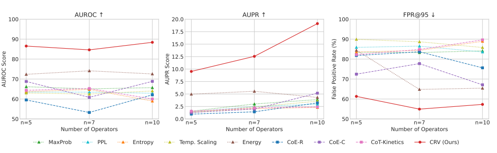 CRV与多种验证方法的性能对比。图中展示了不同方法在算术推理任务下的检测表现。