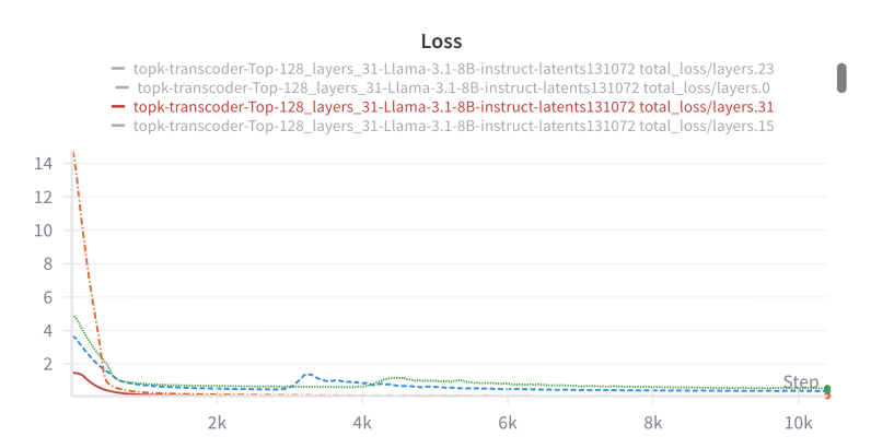 在不同层将MLP替换为Transcoder后,模型的损失值在短时间内迅速下降并趋于稳定。