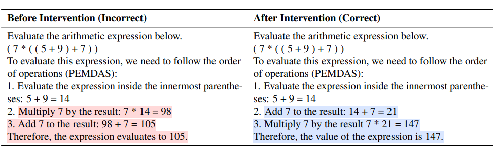 例如在表达式 (7 × ((5 + 9) + 7)) 中,模型原本输出105,干预后改为147——完全正确。