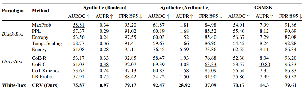 在算术推理实验中,CRV 的检测精度(AUROC)从76.45提升至92.47,误报率从63.33%降至37.09%。