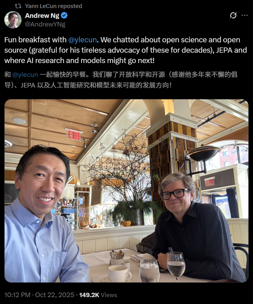 而此时的FAIR领头人LeCun,正一脸愉悦地和吴恩达吃着早饭。