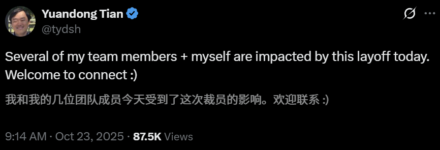 就连FAIR的AI大牛田渊栋,也在裁员之列。