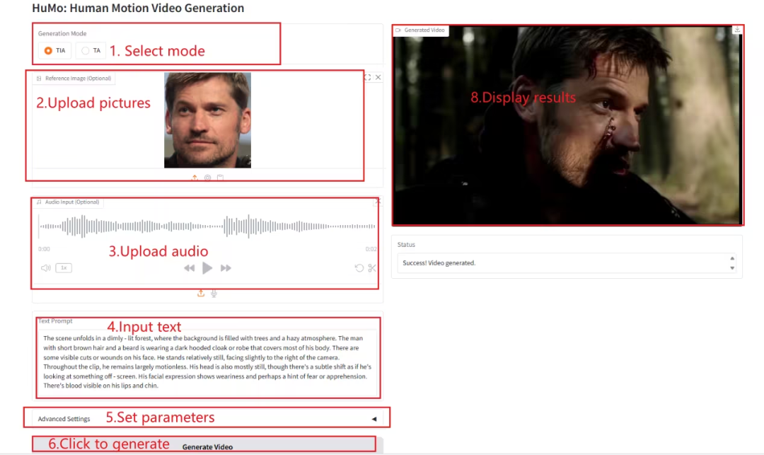 进入 Demo 运行页面后,在文本框内输入相关文字描述,并上传图片以及音频,根据需求调整相关参数,点击「Generate Video」即可生成视频。(注意:当 Sampling Steps 设置为 10 时,生成结果大约需要 3-5 分钟。)
