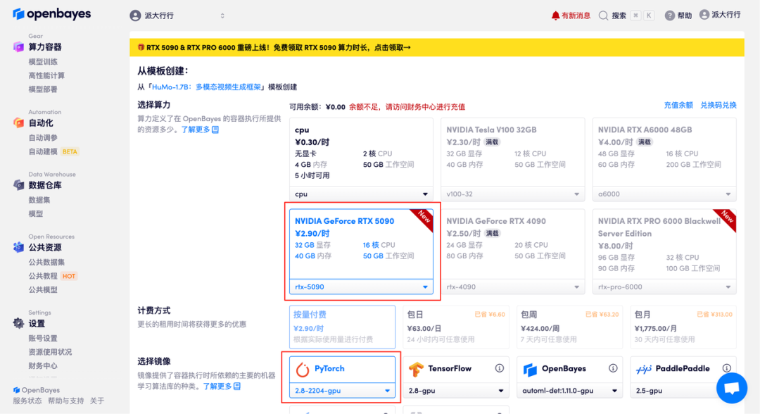 3. 选择「NVIDIA GeForce RTX 5090」以及「PyTorch」镜像,并点击「继续执行」。OpenBayes 平台提供了 4 种计费方式,大家可以按照需求选择「按量付费」或「包日/周/月」。新用户使用下方邀请链接注册,可获得 4 小时 RTX 5090 + 5 小时 CPU 的免费时长!