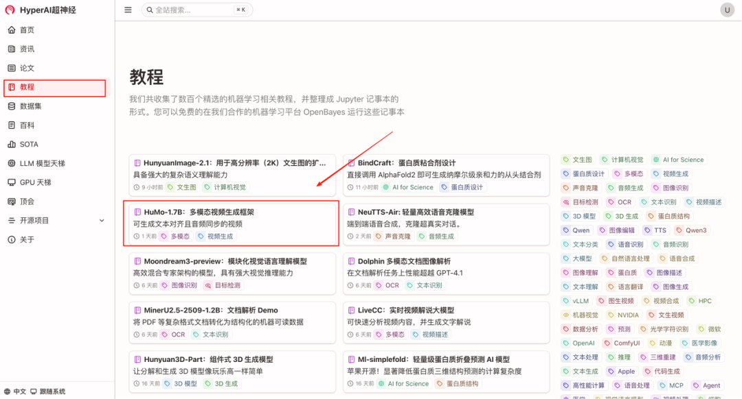 1. 进入 hyper.ai 首页后,选择「教程」页面,并选择「HuMo-1.7B:多模态视频生成框架」,点击「在线运行此教程」。