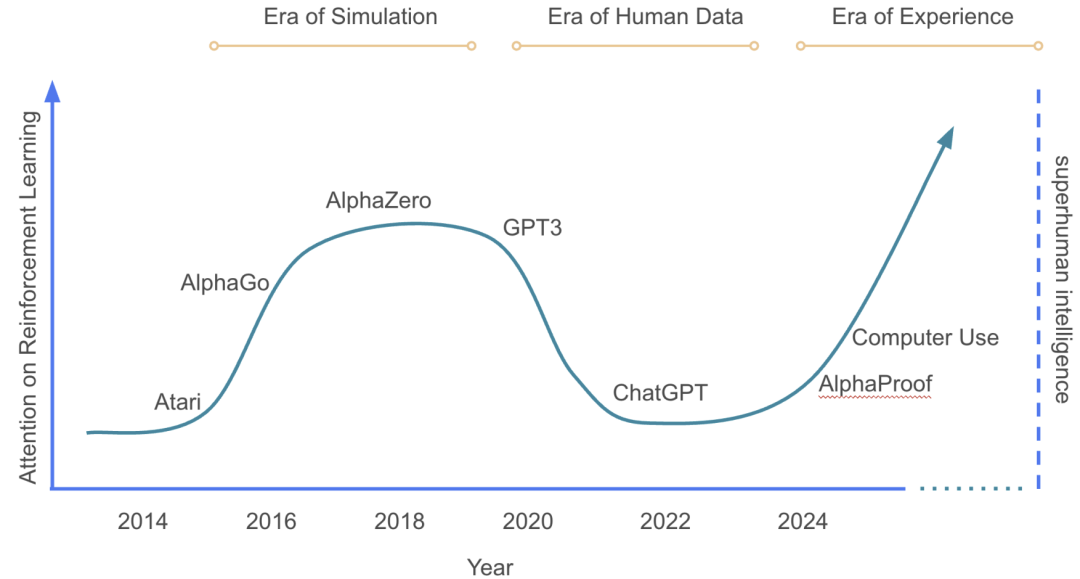 图1. 主流人工智能范式的简要时间轴示意图。纵轴表示该领域总投入和计算资源中专注于强化学习(RL)的比例。截取自David Silver, Richard S. Sutton. Welcome to the Era of Experience.