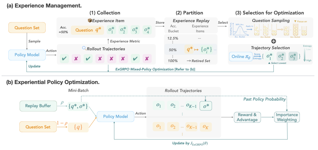 △图3:ExGRPO框架概览:经验管理 + 策略优化