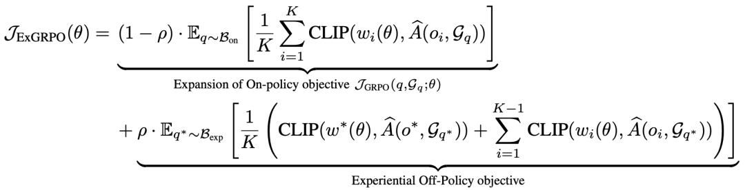 ExGRPO采用了一种混合策略的优化目标,除了对重要性采样进行修正外,在每一次训练迭代中,Mini-Batch中一部分计算资源用于让模型探索全新的问题(On-policy),另一部分则用于学习从经验池中精心筛选出的经验(Off-policy)。