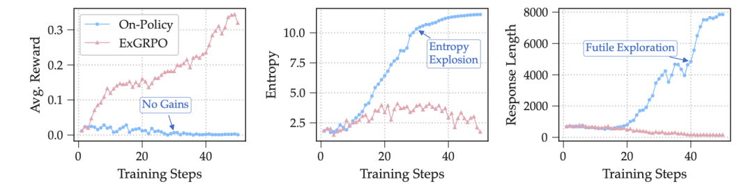 图6:在Llama-3.1 8B训练过程中On-Policy与ExGRPO的学习动态对比。ExGRPO能够稳定训练并获得更高的奖励,而On-Policy则容易出现训练崩溃。