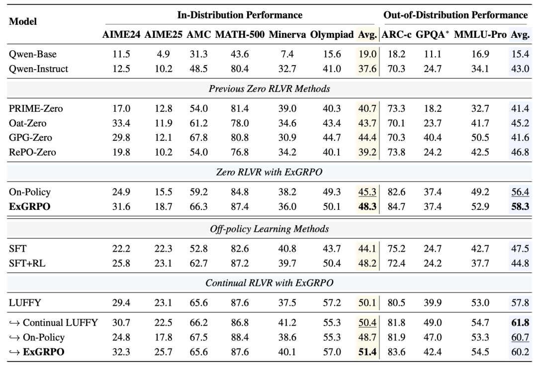 实验结果显示,与传统的在线策略RLVR(基于可验证奖励的强化学习)方法相比,ExGRPO在不同基准上均带来了一定程度的性能提升。