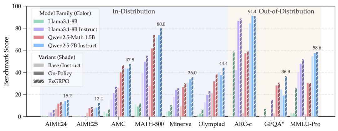 作者在6个不同规模(1.5B到8B)和架构(Qwen、Llama)的模型(Base、Instruct)上,对ExGRPO进行了全面的测试,涵盖了从AIME、MATH等数学推理的 benchmark,到GPQA、MMLU-Pro等通用推理benchmark。